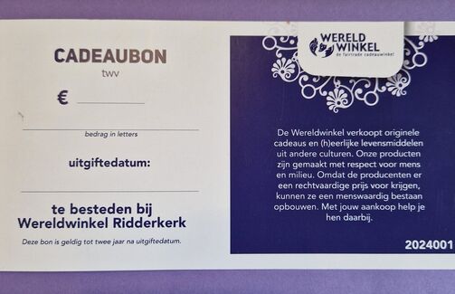 Kunt u geen keuze maken of wilt u dat graag aan degene overlaten waar u een cadeau aan wilt geven, denk dan eens aan de Wereldwinkel Ridderkerk Cadeaubon.